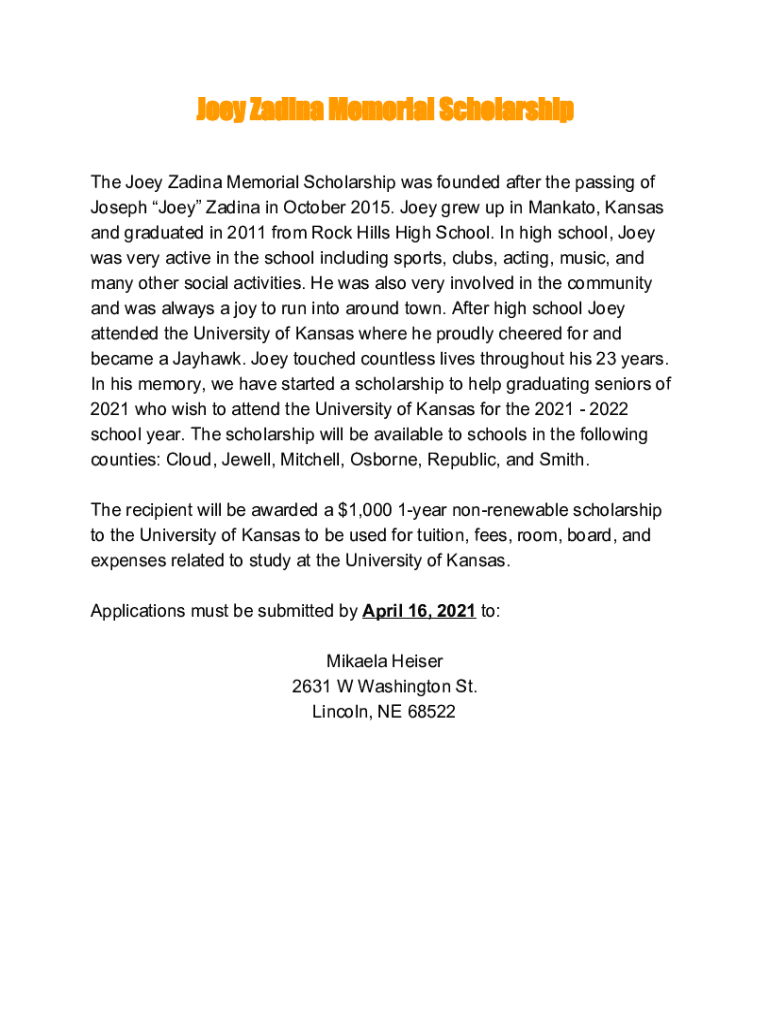 Joey Medina Memorial Scholarship The Joey Medina Memorial Scholarship was founded after the passing of Joseph Joey Medina in October 2015. Joey grew up in Mankato, Kansas and graduated in 2011 from