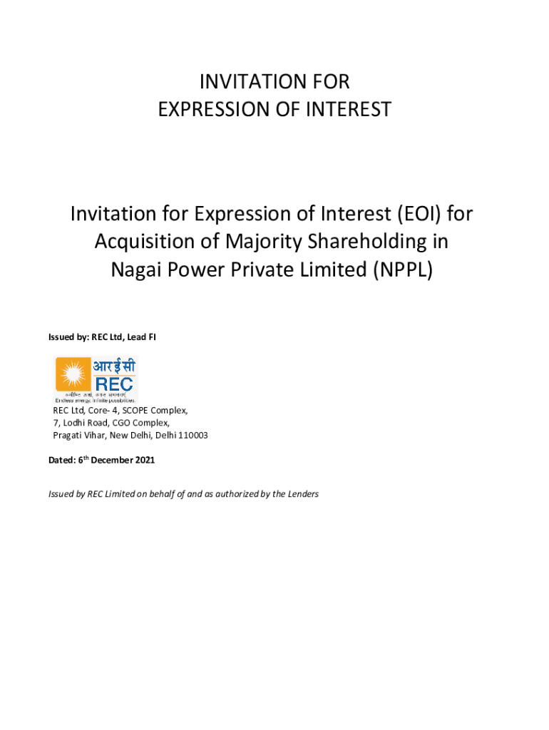 INVITATION FOR EXPRESSION OF INTERESTInvitation for Expression of Interest (EOI) for Acquisition of Majority Shareholding in Nagar Power Private Limited (NPL) Issued by: REC Ltd, Lead FIRE Ltd, Core
