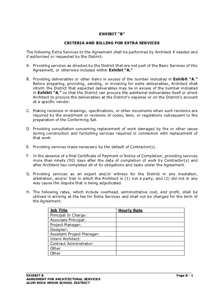 EXHIBIT B CRITERIA AND BILLING FOR EXTRA SERVICES The following Extra Services to the Agreement shall be performed by Architect if needed and if authorized or requested by the District: A. Providing