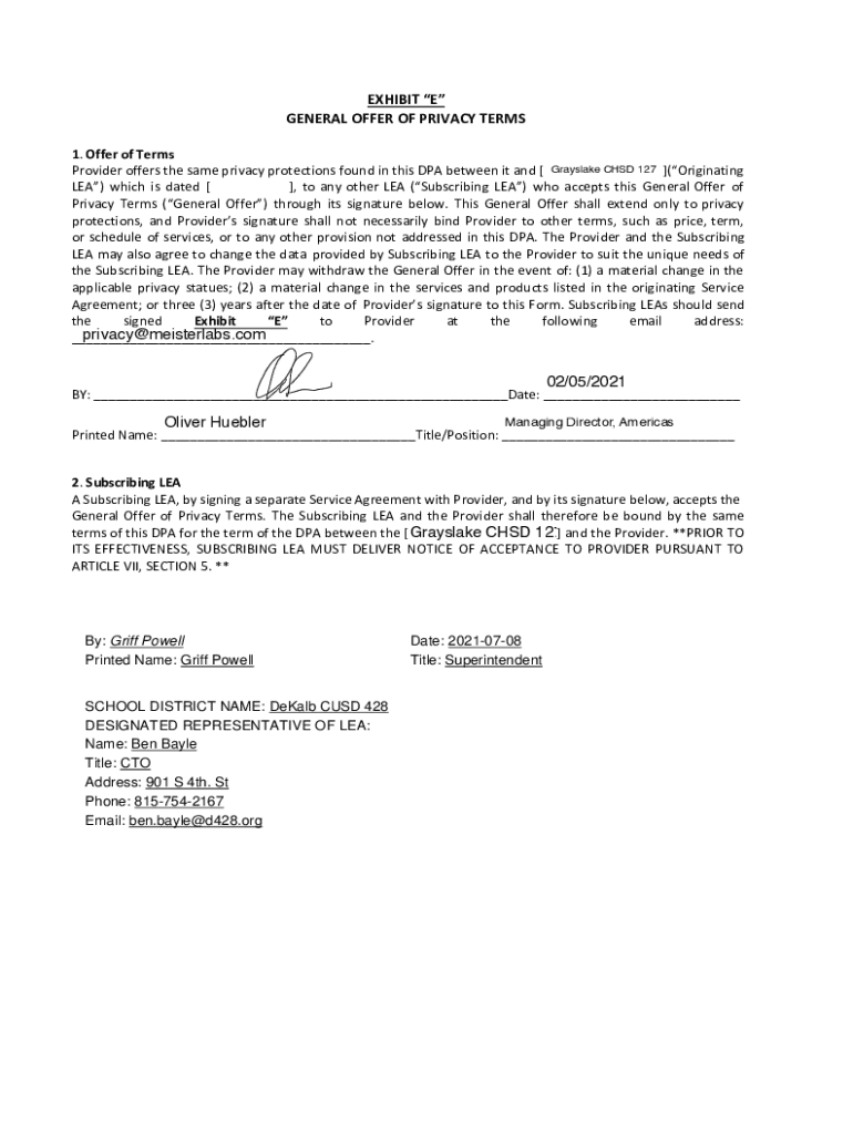 EXHIBIT E GENERAL OFFER OF PRIVACY TERMS 1. Offer of Terms Provider offers the same privacy protections found in this DPA between it and [Grayslake CHAD 127](Originating LEA) which is dated [], to
