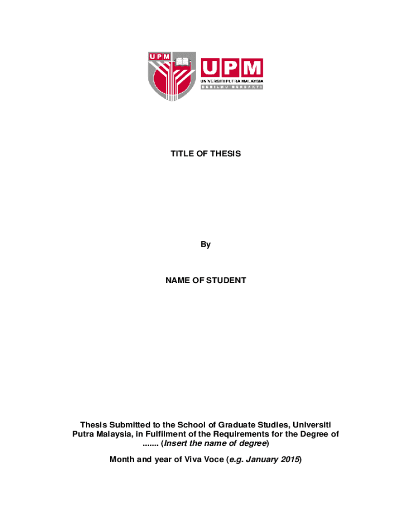 TITLE OF THESISByNAME OF STUDENTThesis Submitted to the School of Graduate Studies, University Petra Malaysia, in Fulfillment of the Requirements for the Degree of ....... (Insert the name of degree)