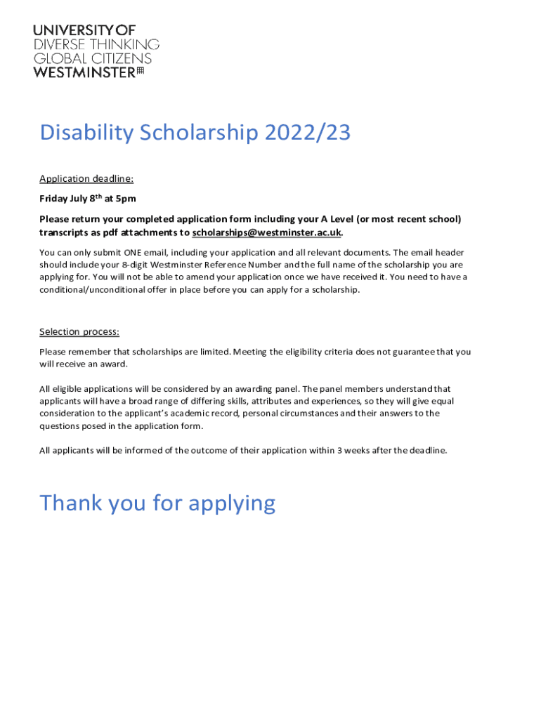 Disability Scholarship 2022/23 Application deadline: Friday, July 8th at 5pm Please return your completed application form including your A Level (or most recent school) transcripts as PDF attachments