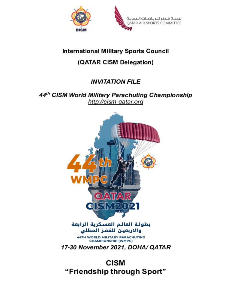 International Military Sports Council (QATAR CASM Delegation) INVITATION FILE 44th CASM World Military Parachuting Championship http://cismqatar.org1730 November 2021, DOHA/ QATARIS Friendship through