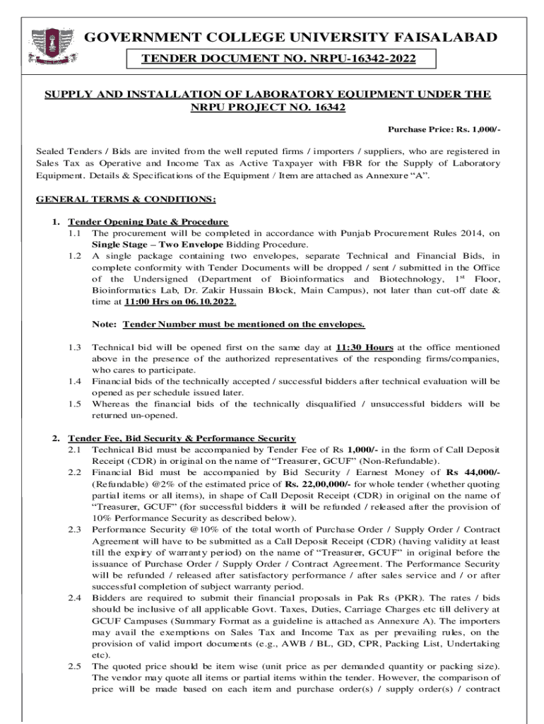 GOVERNMENT COLLEGE UNIVERSITY FAISALABAD TENDER DOCUMENT NO. NRPU163422022 SUPPLY AND INSTALLATION OF LABORATORY EQUIPMENT UNDER THE ARPU PROJECT NO. 16342 Purchase Price: Rs. 1,000/Sealed Tenders