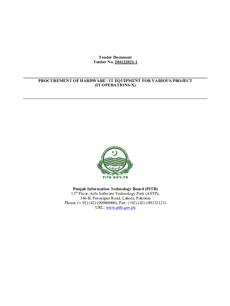 Tender Document Tender No. 2041220211PROCUREMENT OF HARDWARE / IT EQUIPMENT FOR VARIOUS PROJECT (IT OPERATIONS)Punjab Information Technology Board (PIT) 13th Floor, Area Software Technology Park (ASAP),