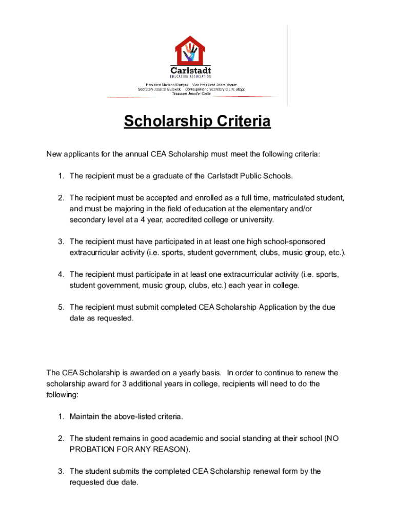 Scholarship Criteria New applicants for the annual CEA Scholarship must meet the following criteria: 1. The recipient must be a graduate of the Carlsbad Public Schools. 2. The recipient must be accepted