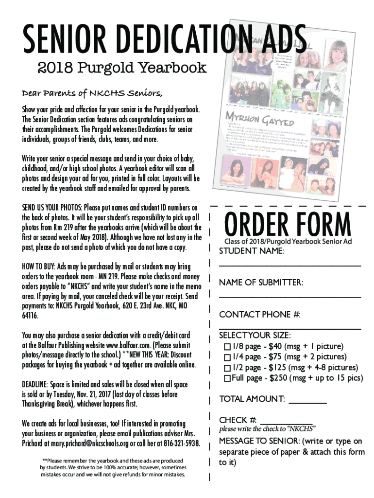 SENIOR DEDICATION ADS 2018 Purged YearbookDear Parents of NK CHS Seniors, Show your pride and affection for your senior in the Purged yearbook. The Senior Dedication section features ads congratulating