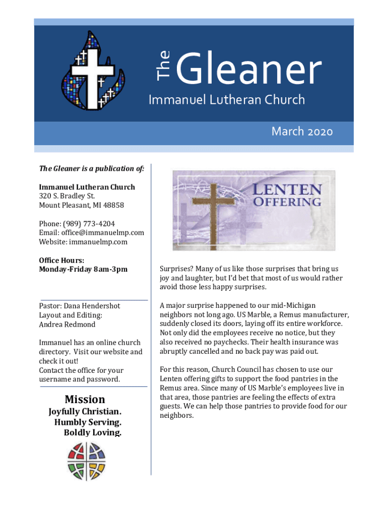 TheGleanerImmanuel Lutheran Church March 2020 The Gleaner is a publication of: Immanuel Lutheran Church 320 S. Bradley St. Mount Pleasant, MI 48858 Phone: (989) 7734204 Email: office@immanuelmp.com