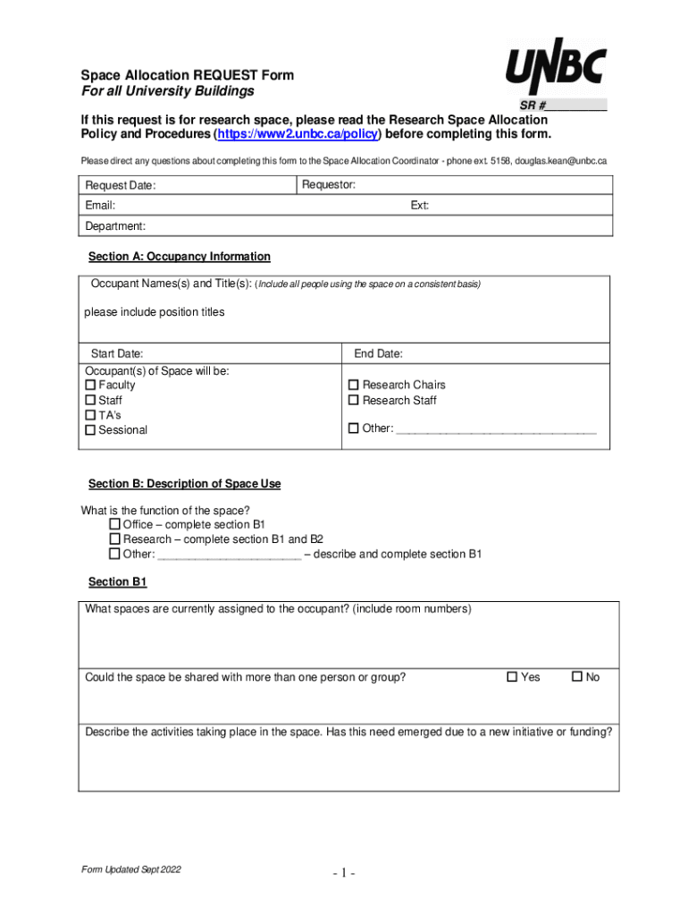 Space Allocation REQUEST Form For all University Buildings SR #___If this request is for research space, please read the Research Space Allocation Policy and Procedures (https://www2.unbc.ca/policy)