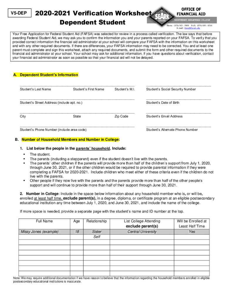 V5DEP20202021 Verification Worksheet Dependent StudentPhone: (870) 543 5909 Faxes: (870) 850 8516 Email: finaid@seark.eduYour Free Application for Federal Student Aid (FAFSA) was selected for review
