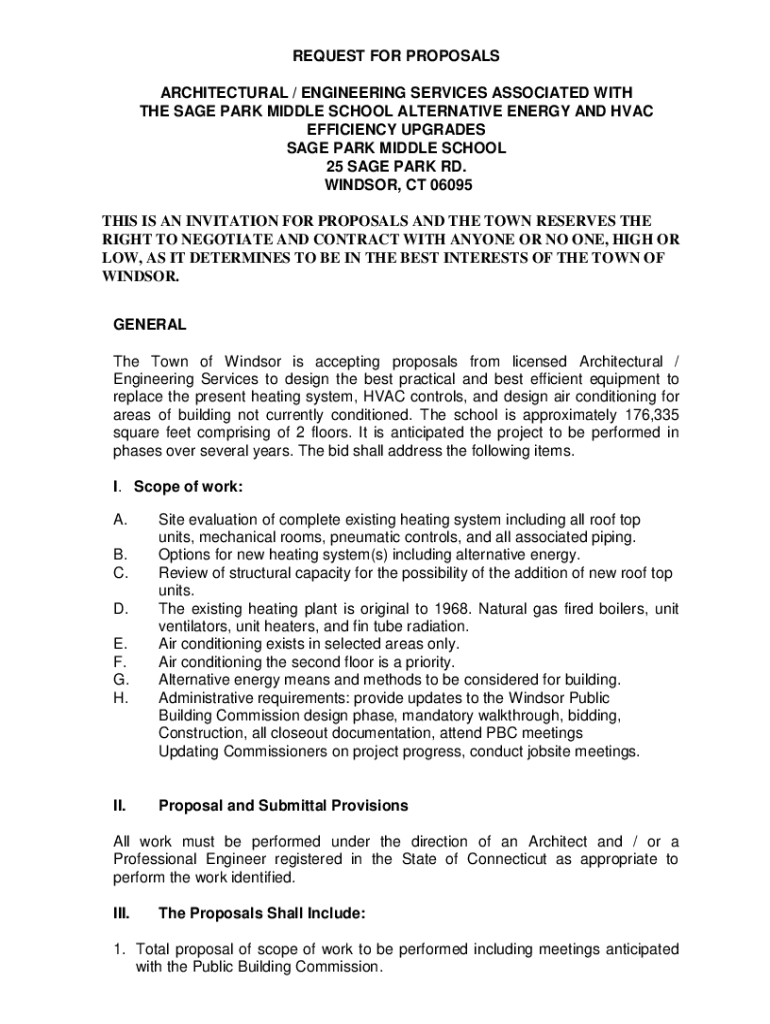 REQUEST FOR PROPOSALS ARCHITECTURAL / ENGINEERING SERVICES ASSOCIATED WITH THE SAGE PARK MIDDLE SCHOOL ALTERNATIVE ENERGY AND HVAC EFFICIENCY UPGRADES SAGE PARK MIDDLE SCHOOL 25 SAGE PARK RD. WINDSOR,