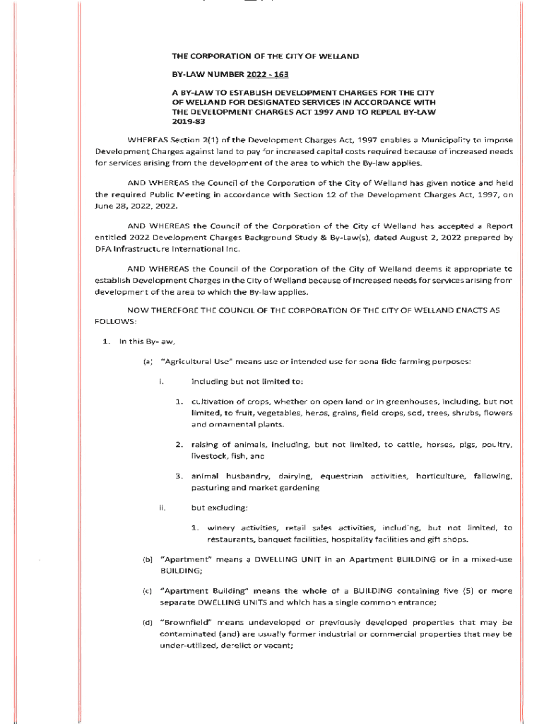 THE CORPORATION OF THE CITY OF WELLAND BYLAW NUMBER 2022 163 A BYLAW TO ESTABLISH DEVELOPMENT CHARGES FOR THE CITY OF WELLAND FOR DESIGNATED SERVICES IN ACCORDANCE WITH THE DEVELOPMENT CHARGES ACT