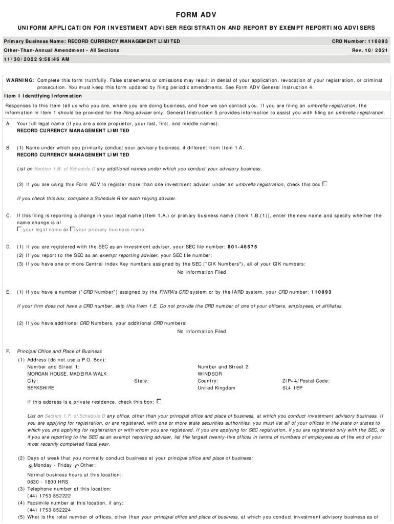 FORM ADV UNIFORM APPLICATION FOR INVESTMENT ADVISER REGISTRATION AND REPORT BY EXEMPT REPORTING ADVISERS Primary Business Name: RECORD CURRENCY MANAGEMENT LIMITED CRD Number: 110893OtherThanAnnual