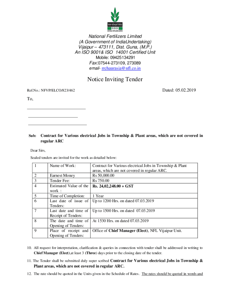 National Fertilizers Limited (A Government of IndiaUndertaking) Jaipur 473111, Dist. Gun, (M.P.) An ISO 9001& ISO 14001 Certified Unit Mobile: 09425134291Fax:07544273109, 273089 email rrchaurasia@nfl.co.inNotice