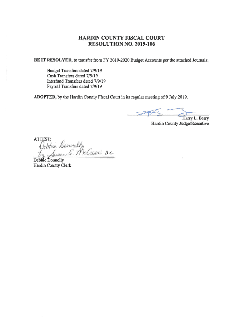 HARDIN COUNTY FISCAL COURT RESOLUTION NO. 2019106 BE IT RESOLVED, to transfer from FY 20192020 Budget Accounts per the attached Journals:Budget Transfers dated 7/9/19 Cash Transfers dated 7/9/19 Interfund