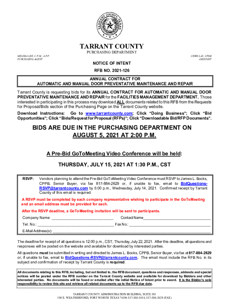 TARRANT COUNTY MELISSA LEE, C.P.M., A.P.P. PURCHASING AGENTPURCHASING DEPARTMENTNOTICE OF INTENTCHRIS LAX, CPM ASSISTANT NO. 2021126 ANNUAL CONTRACT FOR AUTOMATIC AND MANUAL DOOR PREVENTATIVE MAINTENANCE