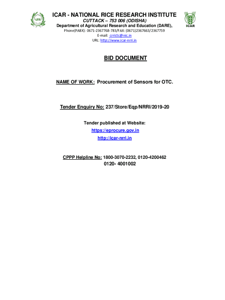 CAR NATIONAL RICE RESEARCH INSTITUTE CUTTACK 753 006 (ODISHA) Department of Agricultural Research and Education (DARE), Phone(PBX): 06712367768783/FAX: (0671)2367663/2367759 Email: crrictc@nic.in