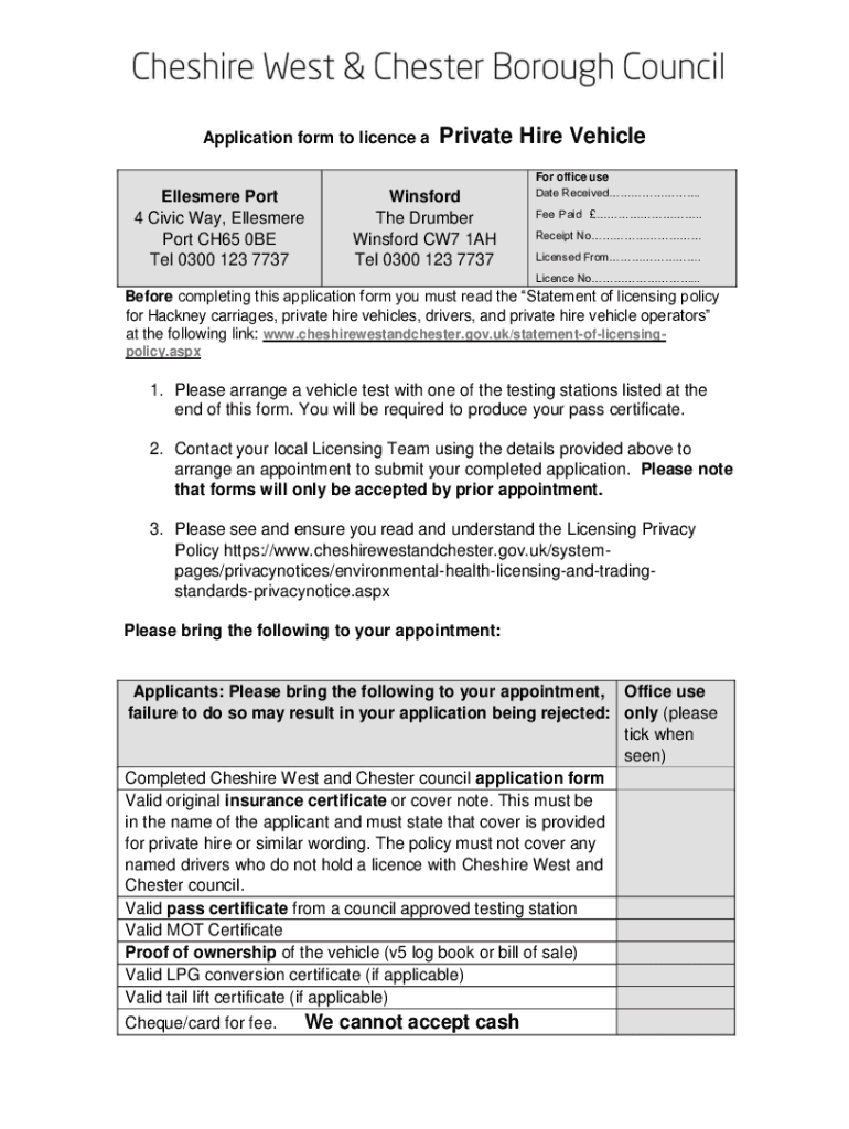 Application form to license Ellesmere Port 4 Civic Way, Ellesmere Port CH65 0BE Tel 0300 123 7737Private Hire VehicleWinsford The Drummer Wins ford CW7 1AH Tel 0300 123 7737For office use Date Received.