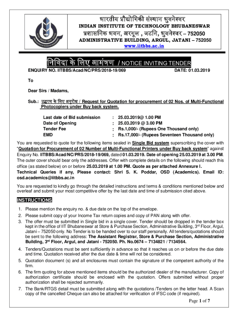 INDIAN INSTITUTE OF TECHNOLOGY BHUBANESWAR,,, 752050 ADMINISTRATIVE BUILDING, ARGUE, JAPAN 752050 www.iitbbs.ac.in /NOTICE INVITING TENDER Inquiry NO. IIT BBS/Acid/NC/PRS/201819/069DATE: 01