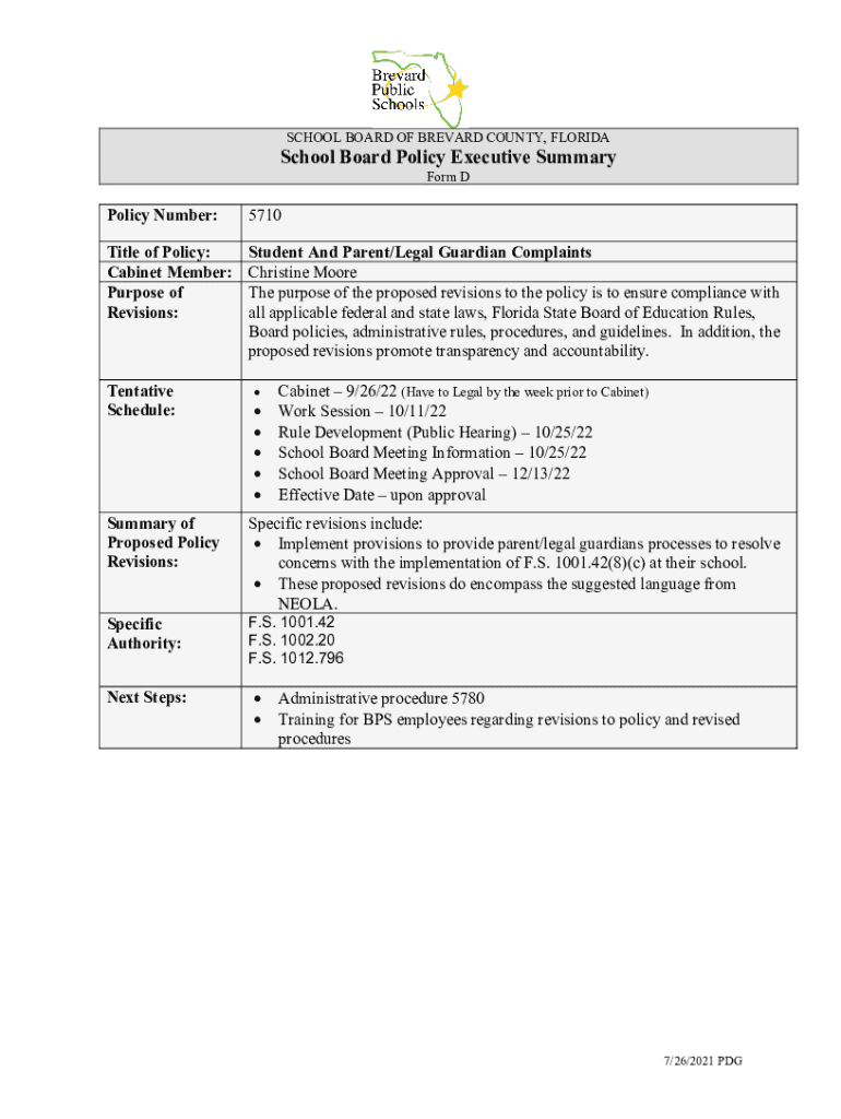 SCHOOL BOARD OF BREVARD COUNTY, FLORIDASchool Board Policy Executive Summary Form Policy Number:5710Title of Policy: Cabinet Member: Purpose of Revisions:Student And Parent/Legal Guardian Complaints