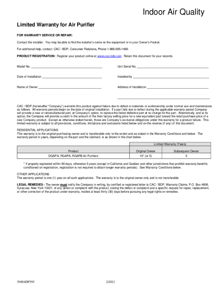 Get the free Limited Warranty for Air Purifier