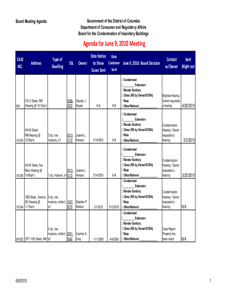 Government of the District of Columbia Department of Consumer and Regulatory Affairs Board for the Condemnation of Insanitary BuildingsBoard Meeting AgendaAgendaforJune9,2010Meeting CASE NO. N/AAddressTypeof