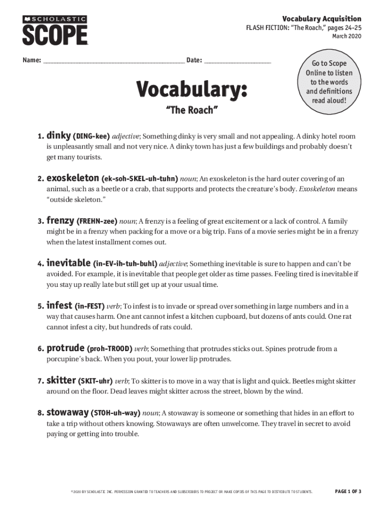 Vocabulary Acquisition FLASH FICTION: The Roach, pages 2425 March 2020 THE LANGUAGE ARTS MAGAZINEName: ___ Date: ___Vocabulary: The Roach to Scope Online to listen to the words and definitions read