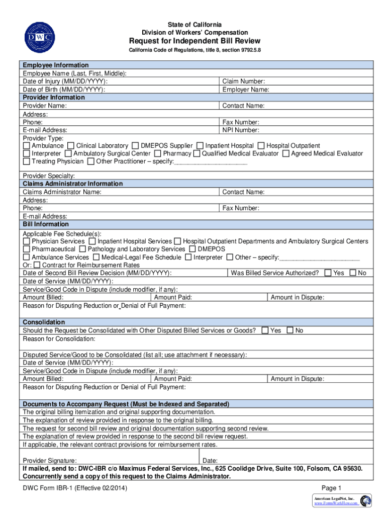 State of California Division of Workers CompensationRequest for Independent Bill Review California Code of Regulations, title 8, section 9792.5.8Employee Information Employee Name (Last, First, Middle):