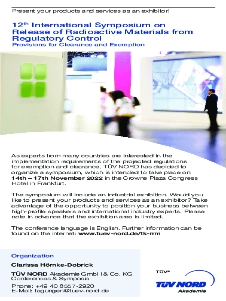 Present your products and services as an exhibitor!12th International Symposium on Release of Radioactive Materials from Regulatory Control Provisions for Clearance and Exemptions experts from many