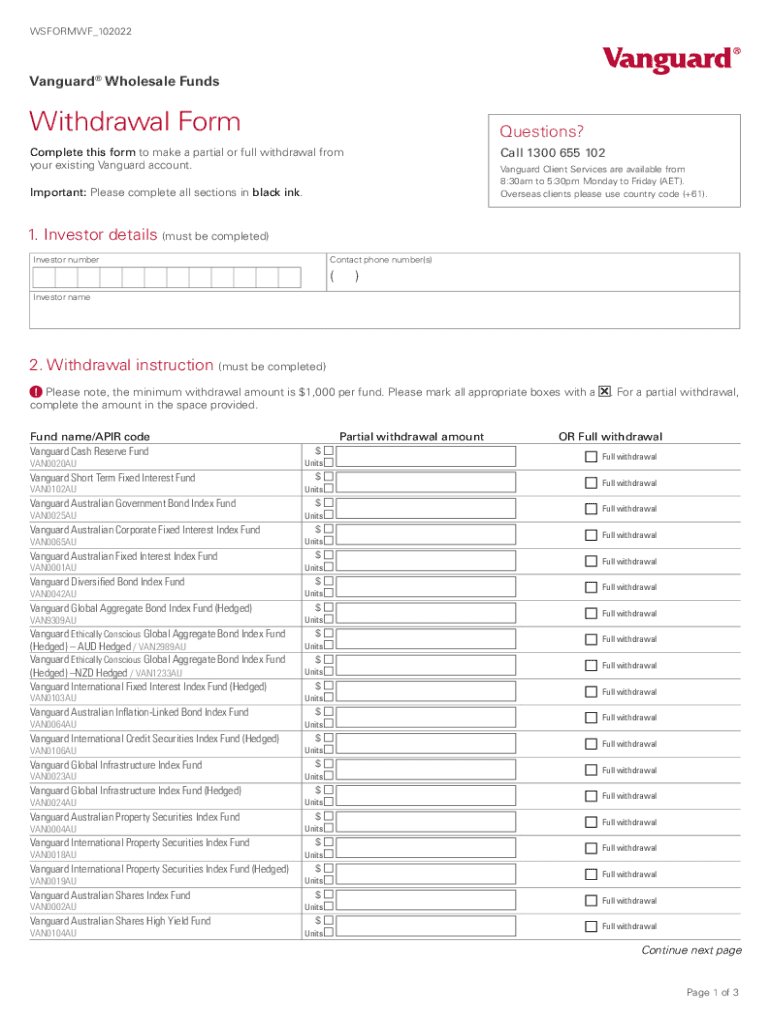 WSFORMWF_102022Vanguard Wholesale FundsWithdrawal Formulations? Call 1300 655 102Complete this form to make a partial or full withdrawal from your existing Vanguard account. Vanguard Client Services