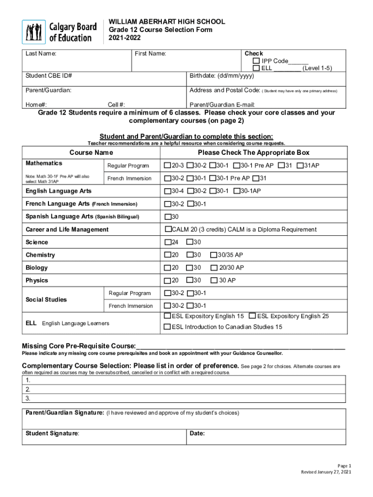 WILLIAM ABERRANT HIGH SCHOOL Grade 12 Course Selection Form 20212022Student CBE ID#Check IPP Code___ ELL ___ (Level 15) Birthdate: (dd/mm/YYY)Parent/Guardian:Address and Postal Code: (Student may
