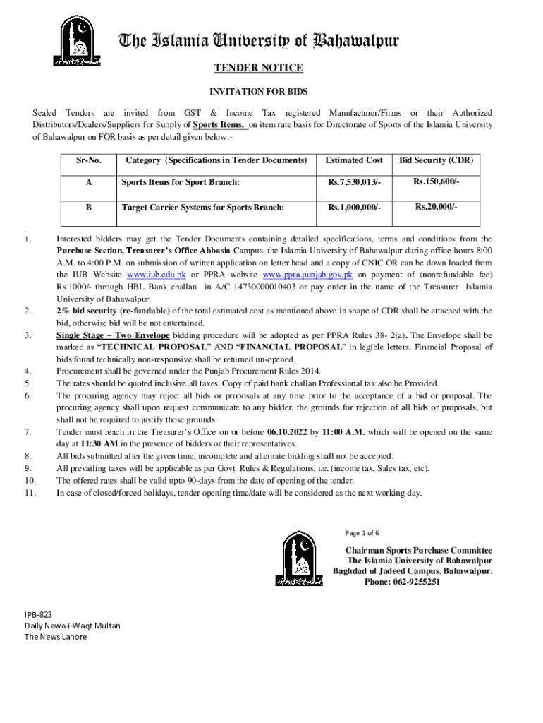 The Islamic University of Bahawalpur TENDER NOTICE INVITATION FOR BIDS Sealed Tenders are invited from GST & Income Tax registered Manufacturer/Firms or their Authorized Distributors/Dealers/Suppliers