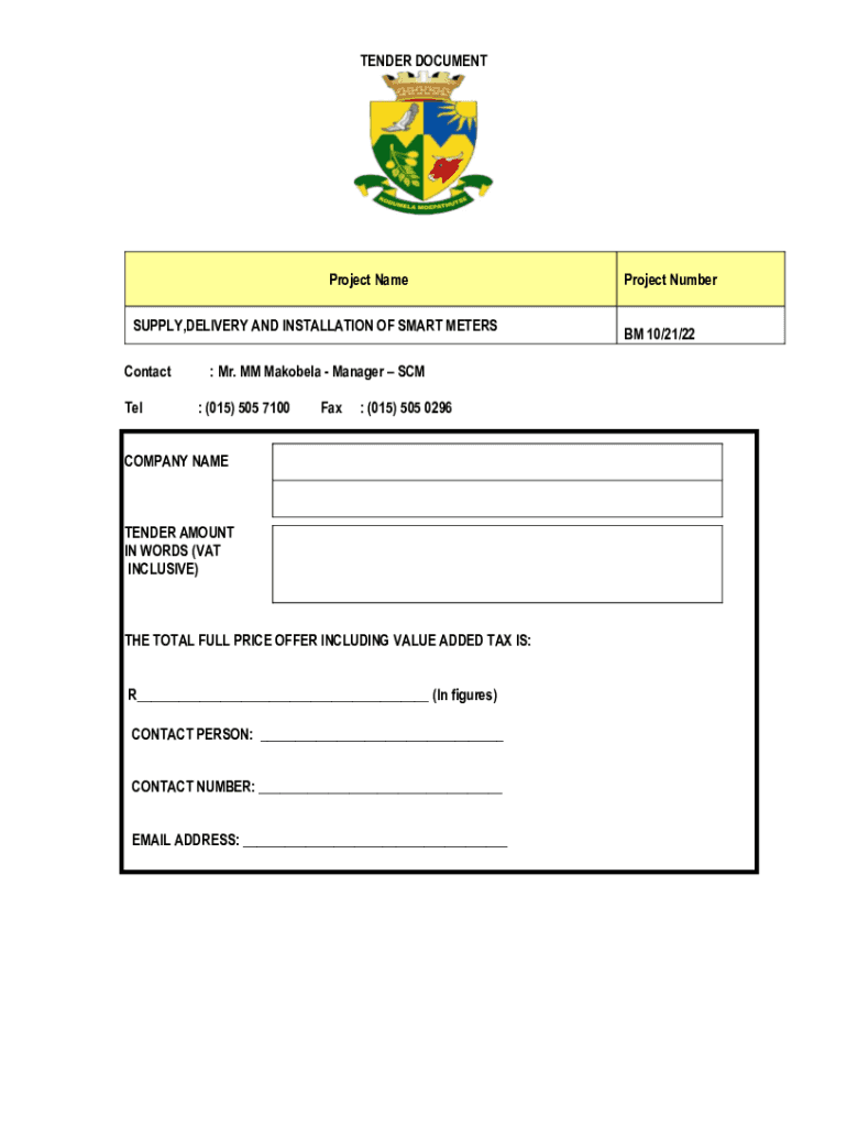 TENDER DOCUMENTProject Name SUPPLY, DELIVERY AND INSTALLATION OF SMART METERS Contact Tel: Mr. MM Mabel Manager SCM : (015) 505 7100Fax: (015) 505 0296COMPANY BARTENDER AMOUNT IN WORDS (VAT INCLUSIVE)THE