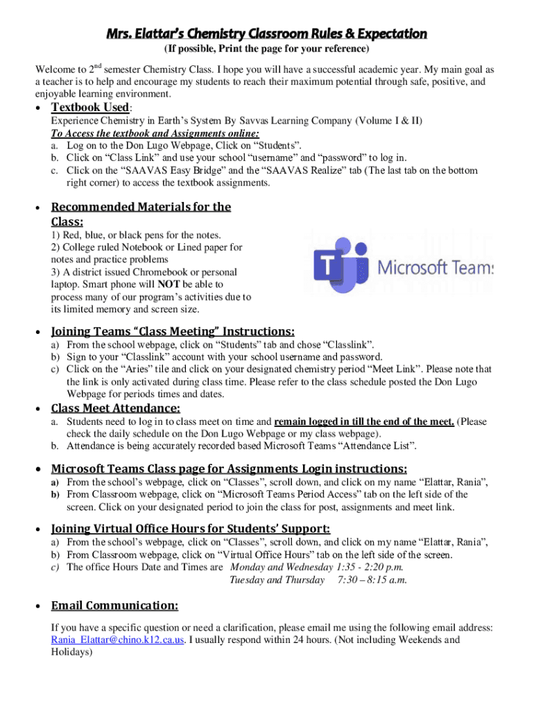 Mrs. Platters Chemistry Classroom Rules & Expectation (If possible, Print the page for your reference) Welcome to 2nd semester Chemistry Class. I hope you will have a successful academic year. My