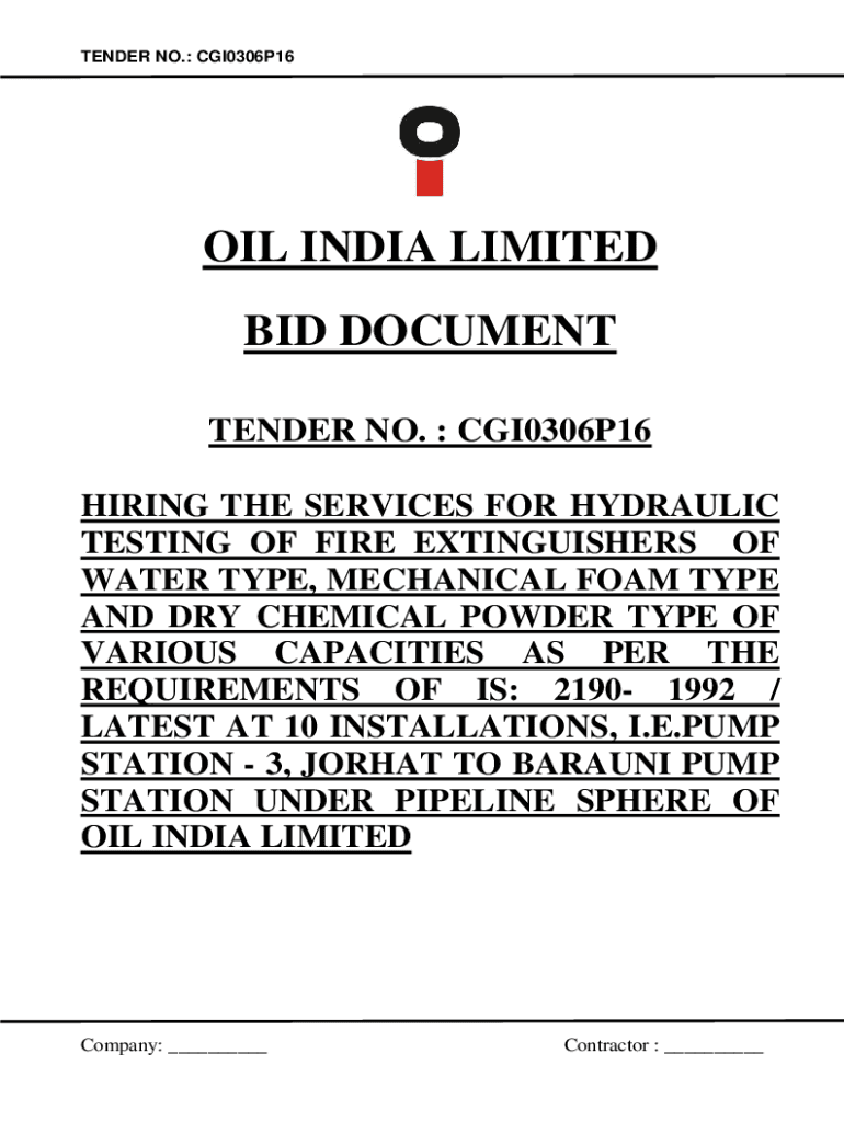 TENDER NO.: CGI0306P16OIL INDIA LIMITED BID DOCUMENT TENDER NO. CGI0306P16 HIRING THE SERVICES FOR HYDRAULIC TESTING OF FIRE EXTINGUISHERS OF WATER TYPE, MECHANICAL FOAM TYPE AND DRY CHEMICAL POWDER