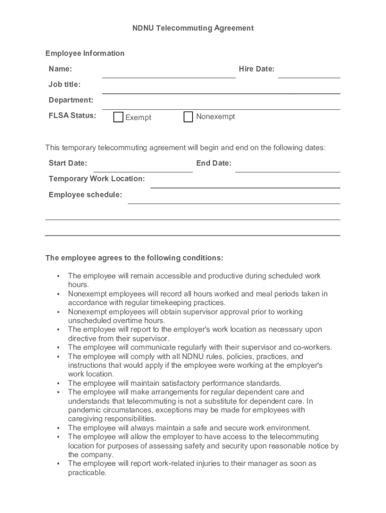 Get the free NDNU Telecommuting Agreement Employee Information ...