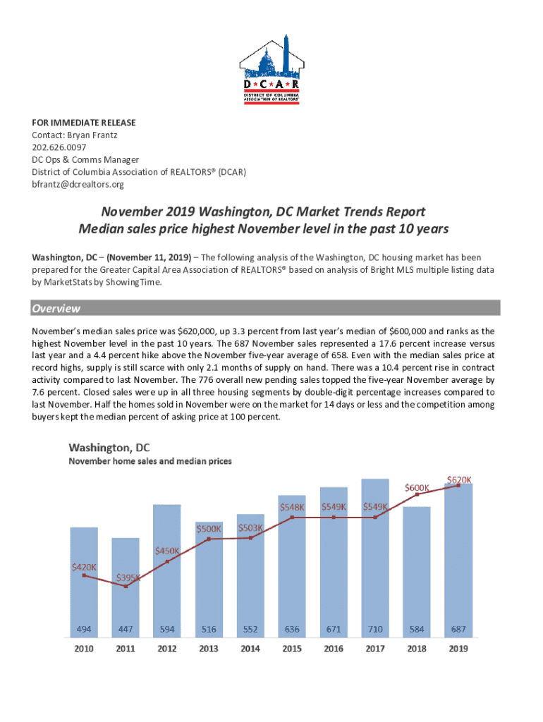 FOR IMMEDIATE RELEASE Contact: Bryan Franz 202.626.0097 DC Ops & Comms Manager District of Columbia Association of REALTORS (CAR) bfrantz@dcrealtors.orgNovember 2019 Washington, DC Market Trends Report