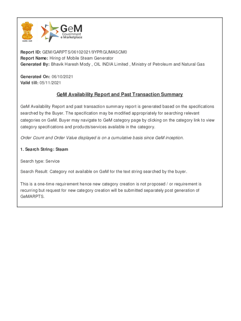 Report ID: GEM/PARTS/06102021/9YPRGUMASCM0 Report Name: Hiring of Mobile Steam Generator Generated By: Batik Harsh Body, OIL INDIA Limited, Ministry of Petroleum and Natural Gas Generated On: 06/10/2021