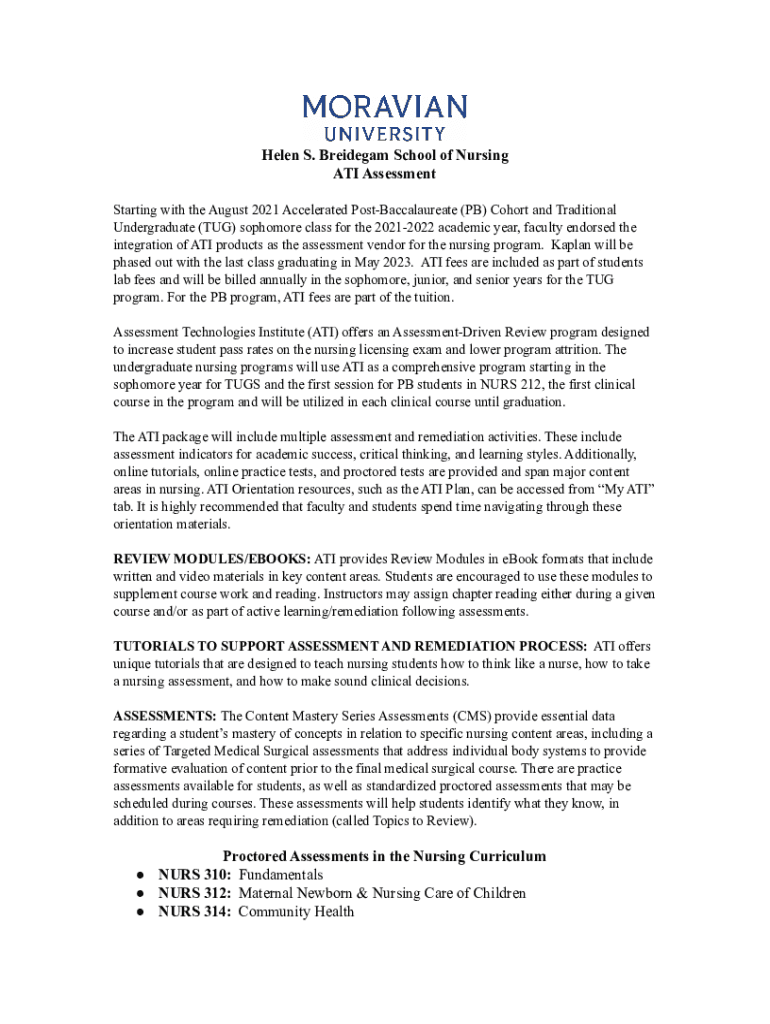 Helen S. Reagan School of Nursing ATI Assessment Starting with the August 2021 Accelerated PostBaccalaureate (PB) Cohort and Traditional Undergraduate (TUG) sophomore class for the 20212022 academic