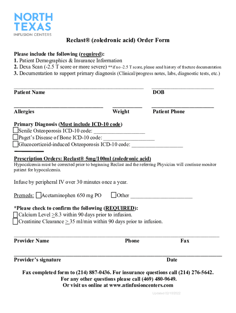Recast (acid) Order Form Please include the following (required): 1. Patient Demographics & Insurance Information 2. DEXA Scan (2.5 T score or more severe) **if no 2.5 T score, please send history