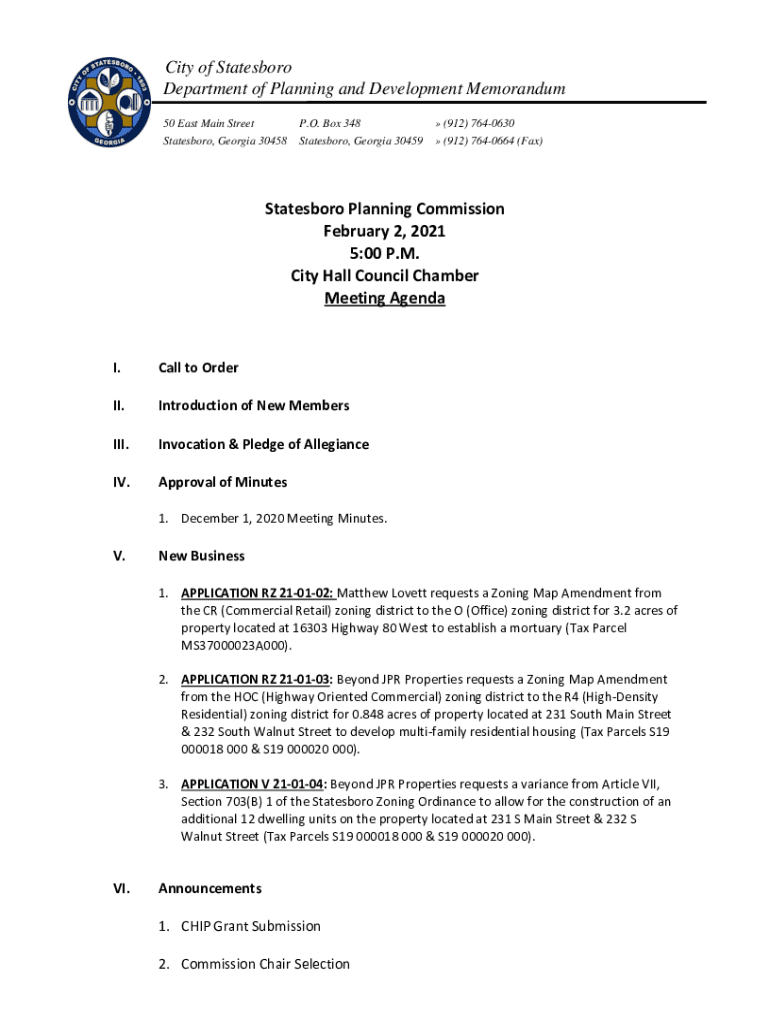 Get the free Statesboro Planning Commission March 2, 2021 5:00 P.M. City Hall ...