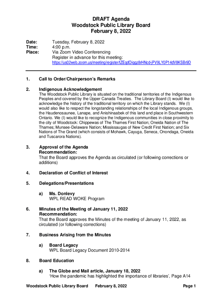 DRAFT Agenda Woodstock Public Library Board February 8, 2022, Date: Time: Place:Tuesday, February 8, 2022 4:00 p.m. Via Zoom Video Conferencing Register in advance for this meeting: https://us02web.zoom.us/meeting/register/tZEqdOiqqz8rHNcdjPV9LY0P14dV8KSBr9D1.