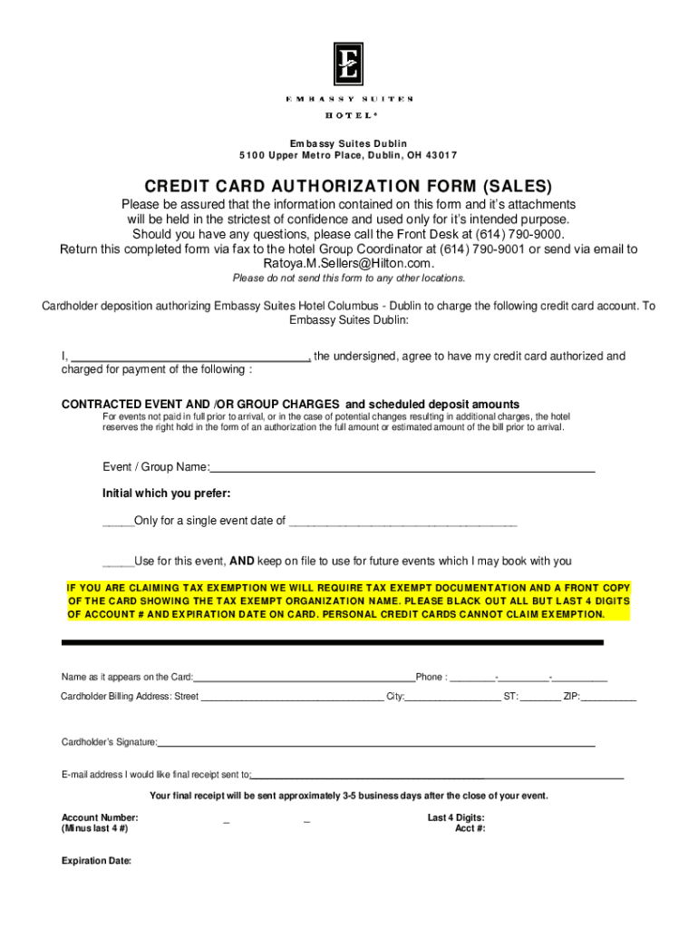 Embassy Suites Dublin 5100 Upper Metro Place, Dublin, OH 43017CREDIT CARD AUTHORIZATION FORM (SALES) Please be assured that the information contained on this form and its attachments will be held