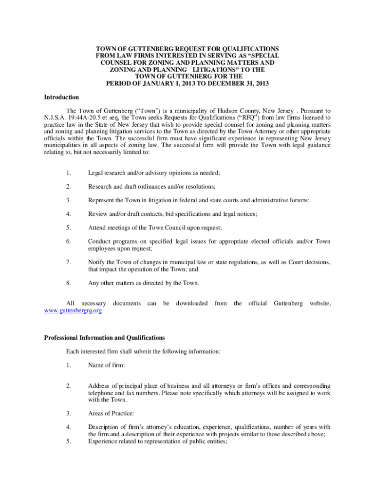 TOWN OF GUTENBERG REQUEST FOR QUALIFICATIONS FROM LAW FIRMS INTERESTED IN SERVING AS SPECIAL COUNSEL FOR ZONING AND PLANNING MATTERS AND ZONING AND PLANNING LITIGATION TO THE TOWN OF GUTENBERG FOR