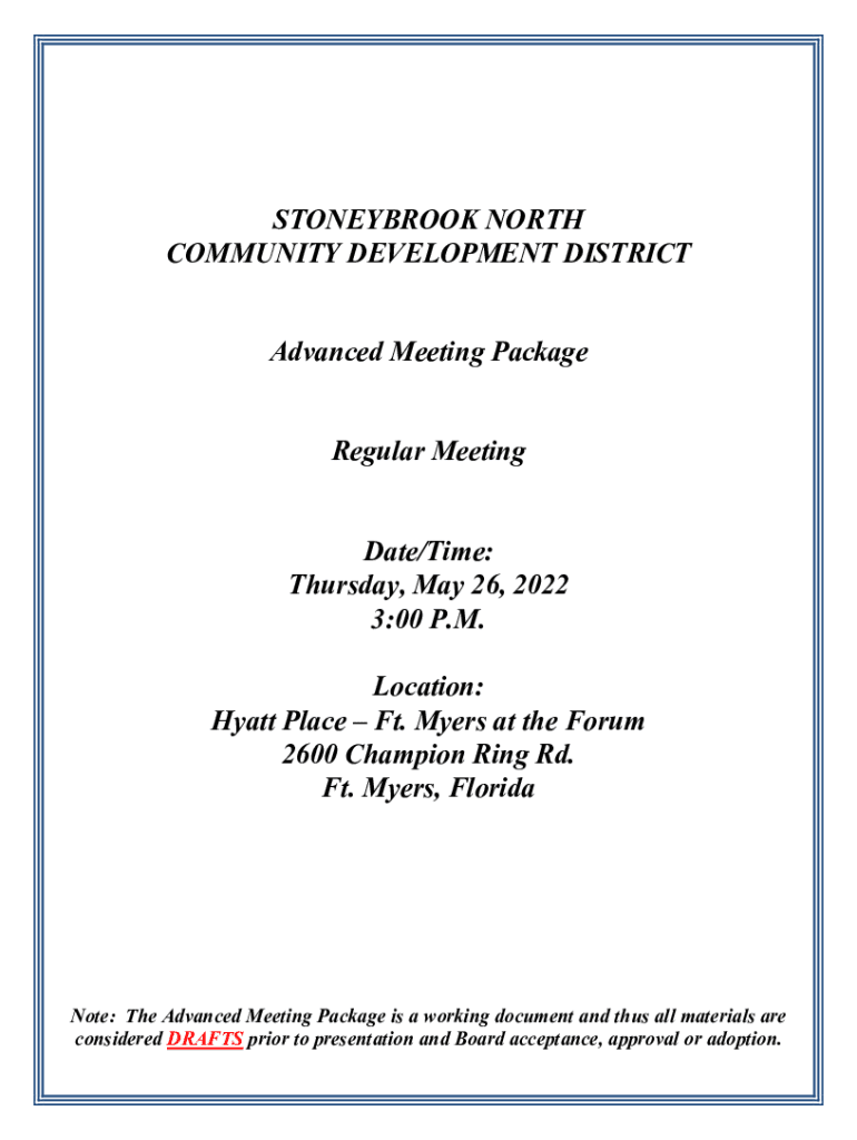 STORYBOOK NORTH COMMUNITY DEVELOPMENT DISTRICT Advanced Meeting Package Regular Meeting Date/Time: Thursday, May 26, 2022 3:00 P.M. Location: Hyatt Place Ft. Myers at the Forum 2600 Champion Ring