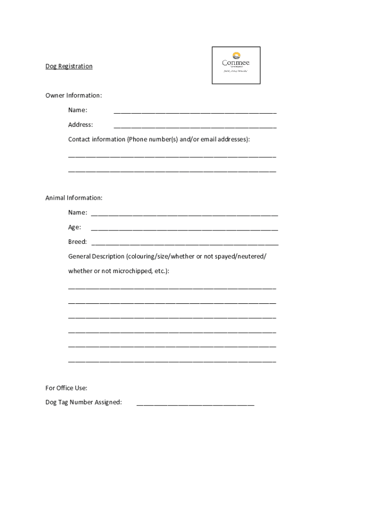 Dog RegistrationOwner Information: Name:___Address:___Contact information (Phone number(s) and/or email addresses): ___ ___Animal Information: Name: ___ Age:___Breed: ___ General Description (coloring/size/whether
