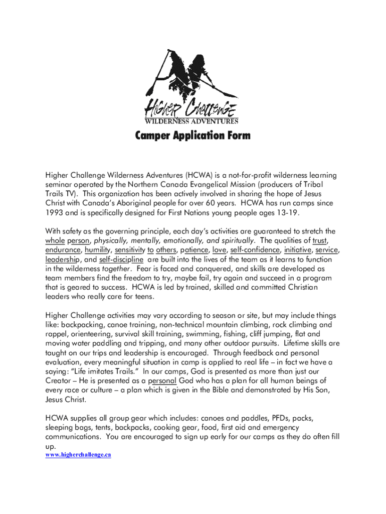 Camper Application Foreigner Challenge Wilderness Adventures (CWA) is a notforprofit wilderness learning seminar operated by the Northern Canada Evangelical Mission (producers of Tribal Trails TV).