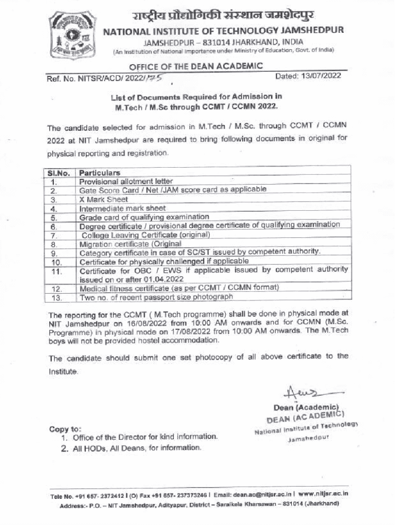 FORM NO: NITER/ACD ADM/001jk\” VH; ks|sixth laLFkku the\'knife NATIONAL INSTITUTE OF TECHNOLOGY JAMSHEDPUR 831014, Jharkhand, India (An Institution of National Importance under MHD, Govt. of India)Academic