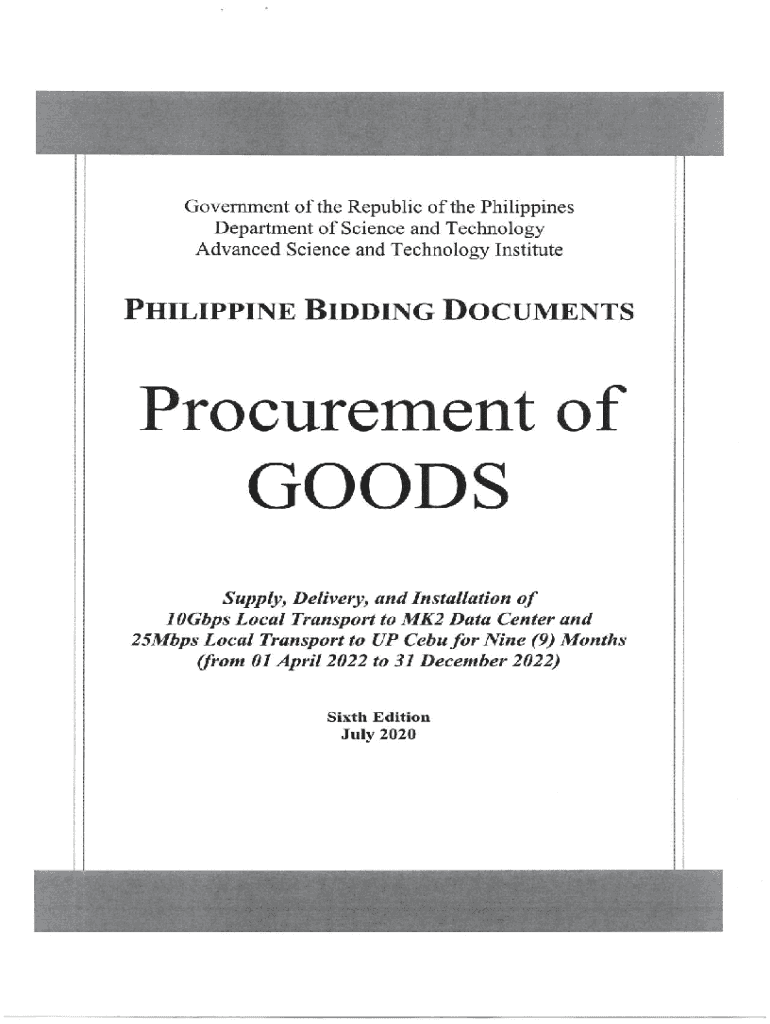 Section II. Instructions to Bidders111. Scope of Bid The Procuring Entity, DISTASTE wishes to receive Bids for the Supply, Delivery, and Installation of 10Gbps Local Transport to MK2 Data Center and