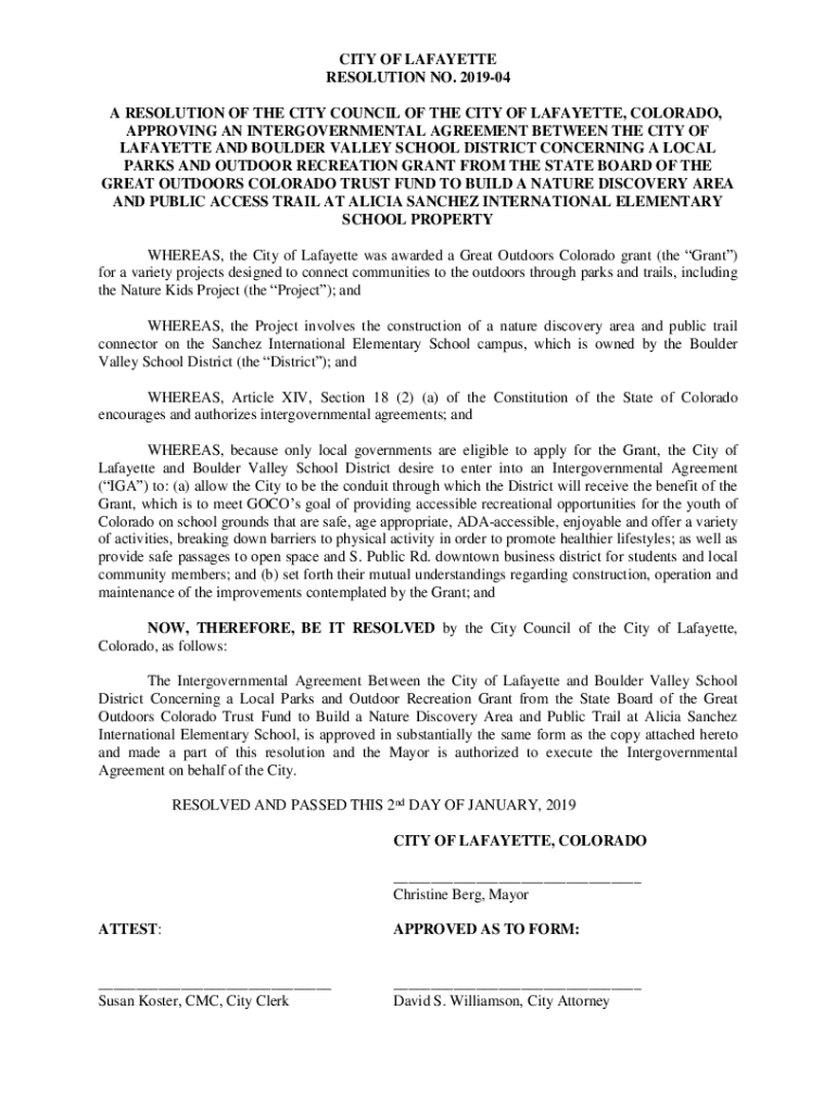 CITY OF LAFAYETTE RESOLUTION NO. 201904 A RESOLUTION OF THE CITY COUNCIL OF THE CITY OF LAFAYETTE, COLORADO, APPROVING AN INTERGOVERNMENTAL AGREEMENT BETWEEN THE CITY OF LAFAYETTE AND BOULDER VALLEY
